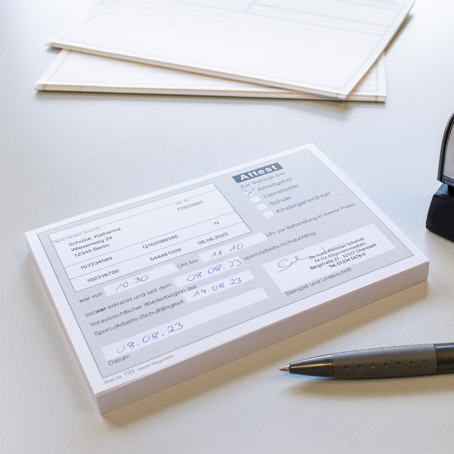 Optimieren Sie den Alltag in Ihrer Praxis mit unseren individuell gestalteten Arztformularen und Praxisformularen. Egal, ob Anamnesebogen, Bescheinigungen oder Attest-Vorlagen – wir bieten Ihnen eine große Auswahl an Vordrucken, die perfekt auf Ihre Bedürfnisse zugeschnitten sind. Alle Arzt Formulare sind so gestaltet, dass sie den Arbeitsablauf in Ihrer Praxis erleichtern und einen professionellen Eindruck hinterlassen.