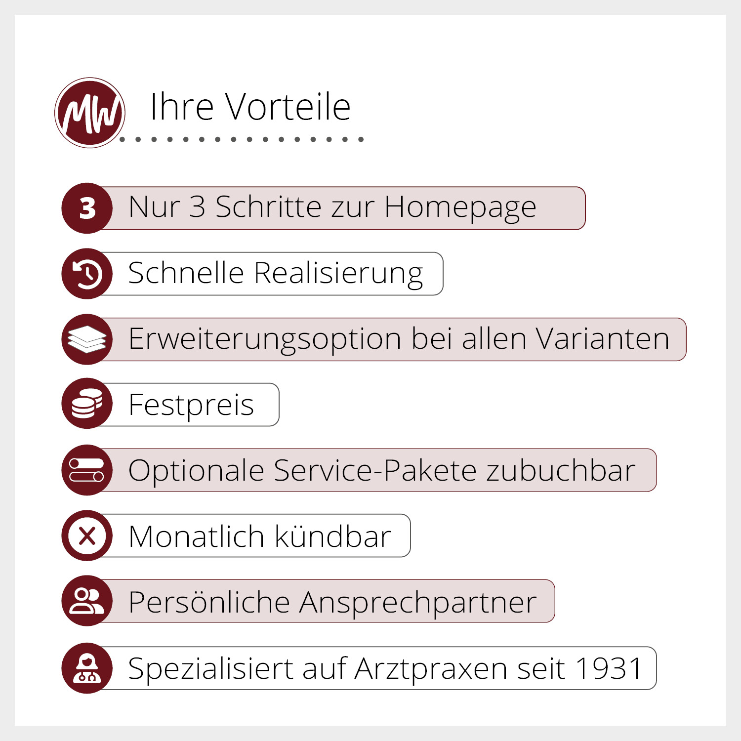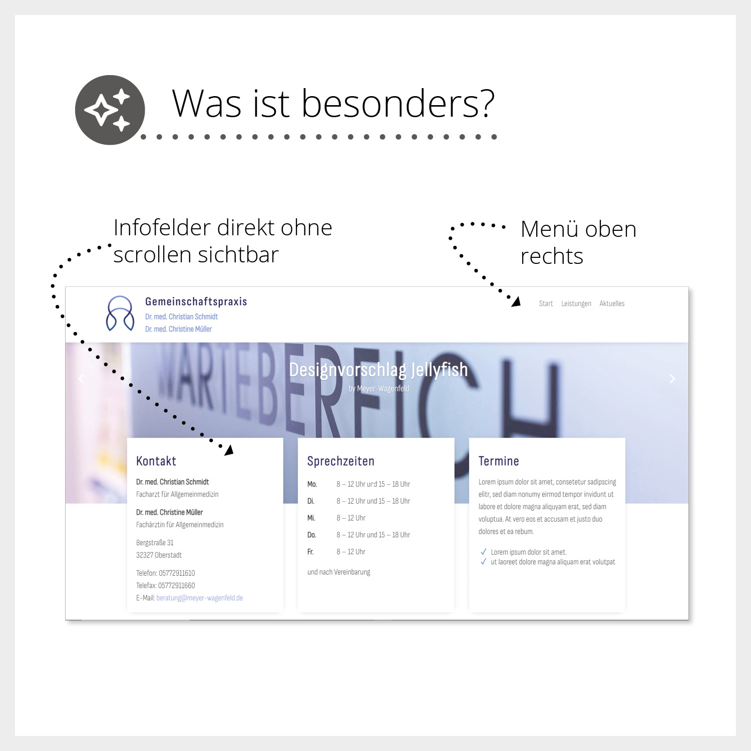 Die Starter-Website ist als sogenannter Onepager konzipiert und bietet eine klare, übersichtliche Darstellung Ihrer Praxis. Ideal für kleinere Praxen aller Fachrichtungen oder für Praxen, die sich auf das Wesentliche konzentrieren möchten. Ihre Patientinnen und Patienten finden hier schnell alle wichtigen Informationen. Enthalten sind: