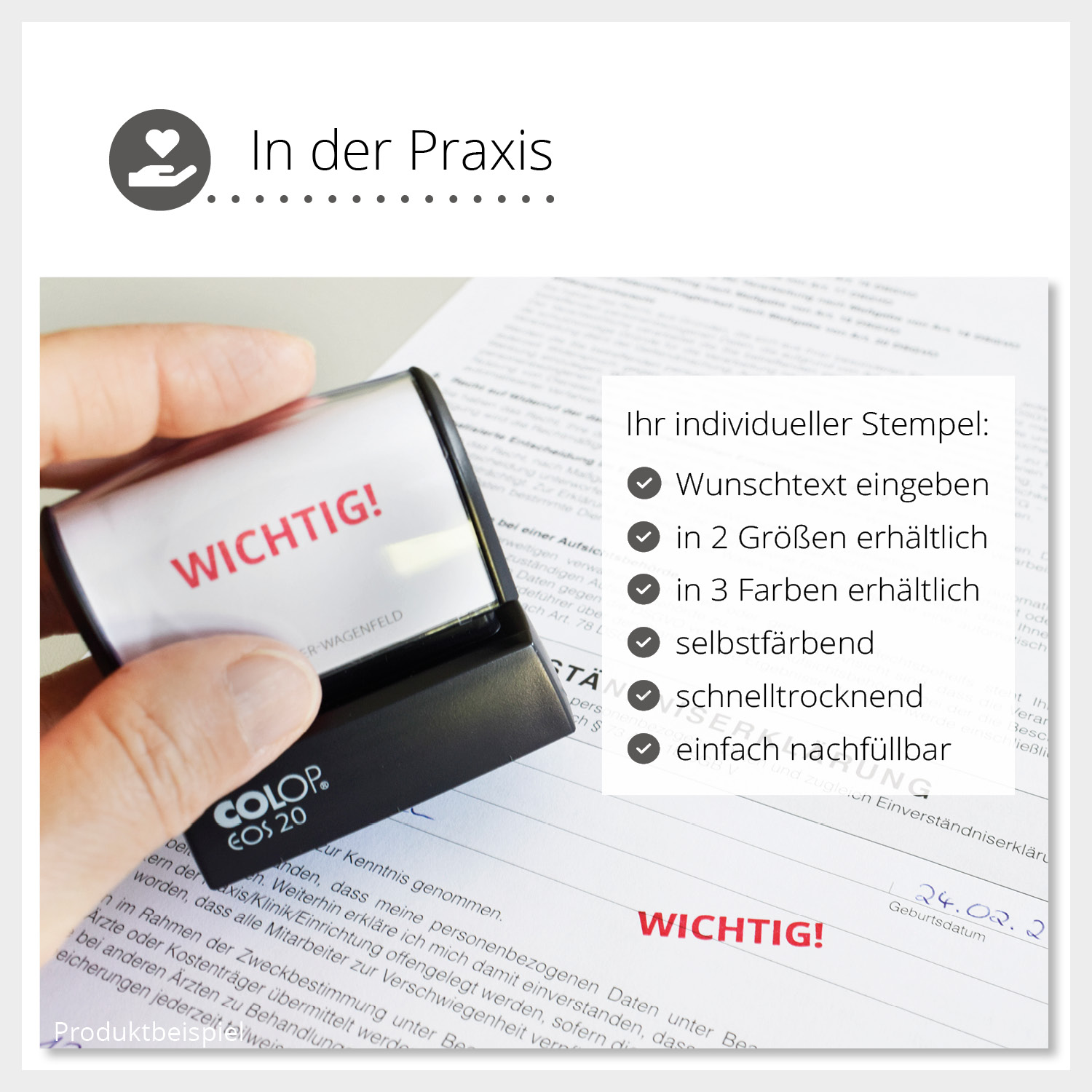 Dank Flash-Technologie ist die Textplatte des Colop-Praxisstempels ständig mit Farbe getränkt, sodass kein extra Stempelkissen erforderlich ist. Das macht das Handling dieses Stempels im Praxisalltag und auch unterwegs äußerst angenehm. Zudem sind mit nur einer Farbfüllung bis zu 5.000 präzise Abdrücke möglich.