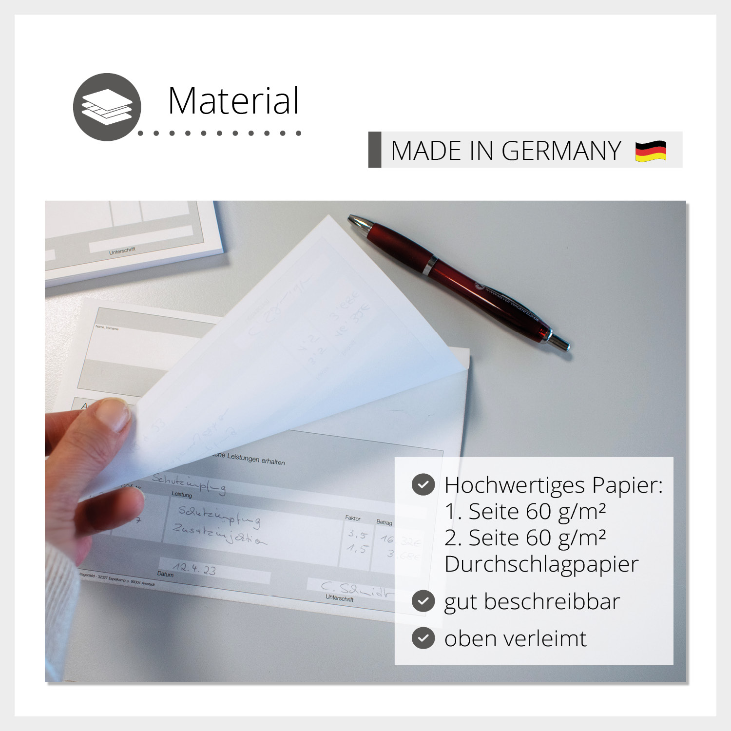Diese Vordrucke werden aus hochwertigem Durchschlagpapier (1. Seite 60 g/m², 2. Seite 60 g/g/m²) gefertigt und in der hauseigenen Druckerei bedruckt, sodass Sie ein qualitatives Produkt erhalten.