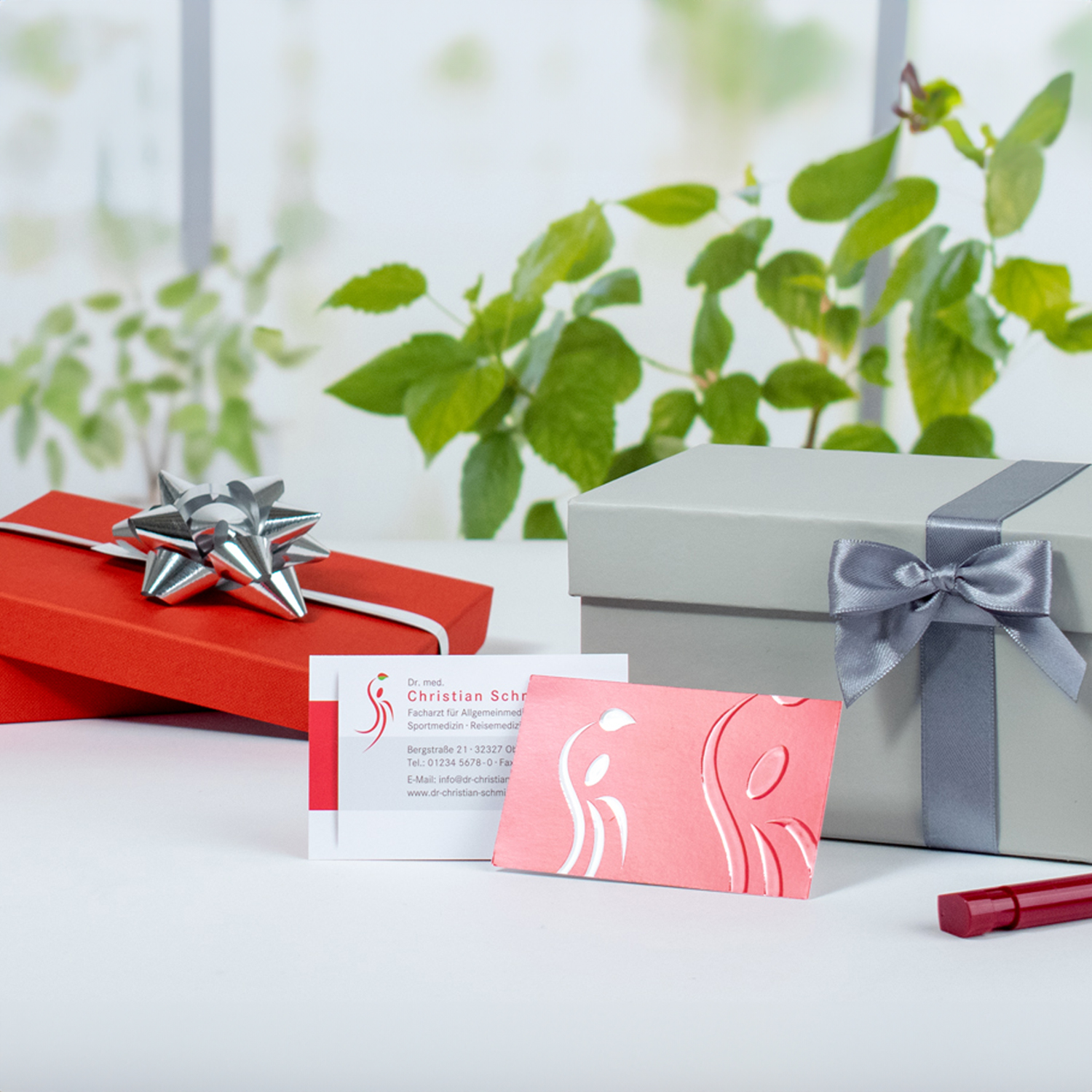 Wenn Sie den Beschenkten gut kennen, bereiten Sie mit einem individuell gestalteten und personalisierten Geschenk eine ganz besondere Freude. Wie wäre es zum Beispiel mit einem schön gestalteten Notizblock für den Schreibtisch oder eigenen Kugelschreibern mit dem Praxislogo?
