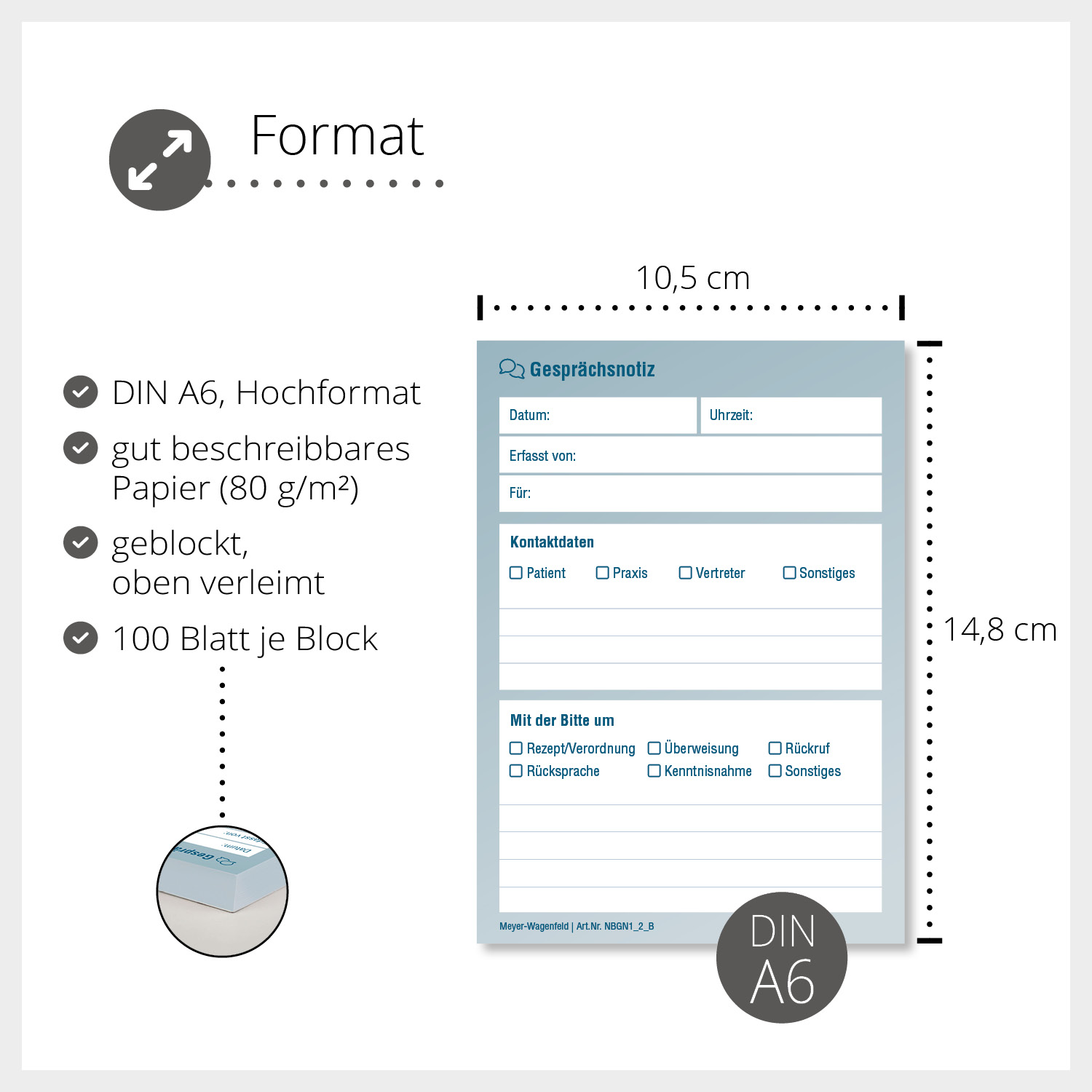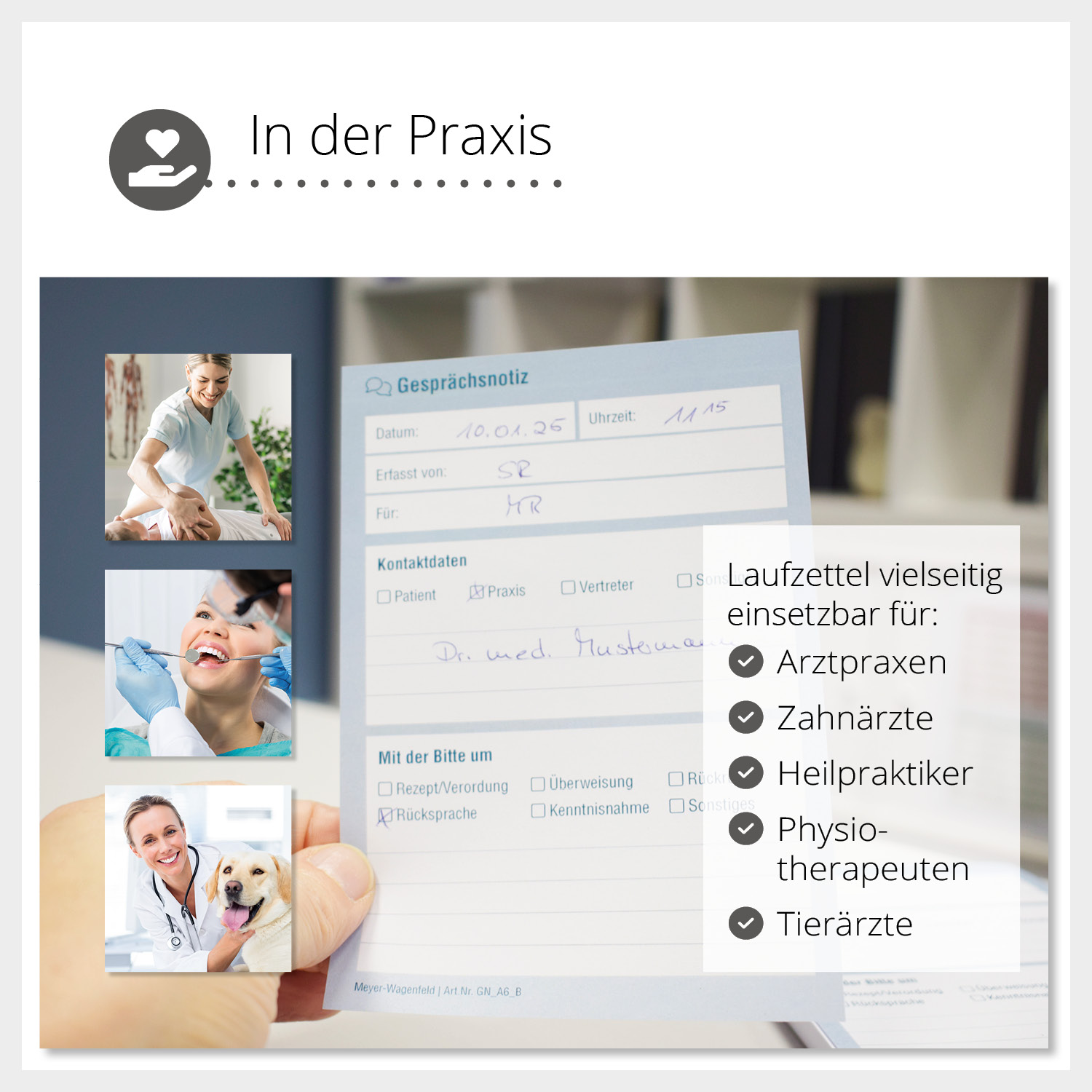 Als praktischer Block eignen sich die Gesprächsnotizen sowohl für Arztpraxen aller Fachrichtungen als auch für Heilpraktiker, Tierärzte, Physiotherapeuten und Zahnärzte.