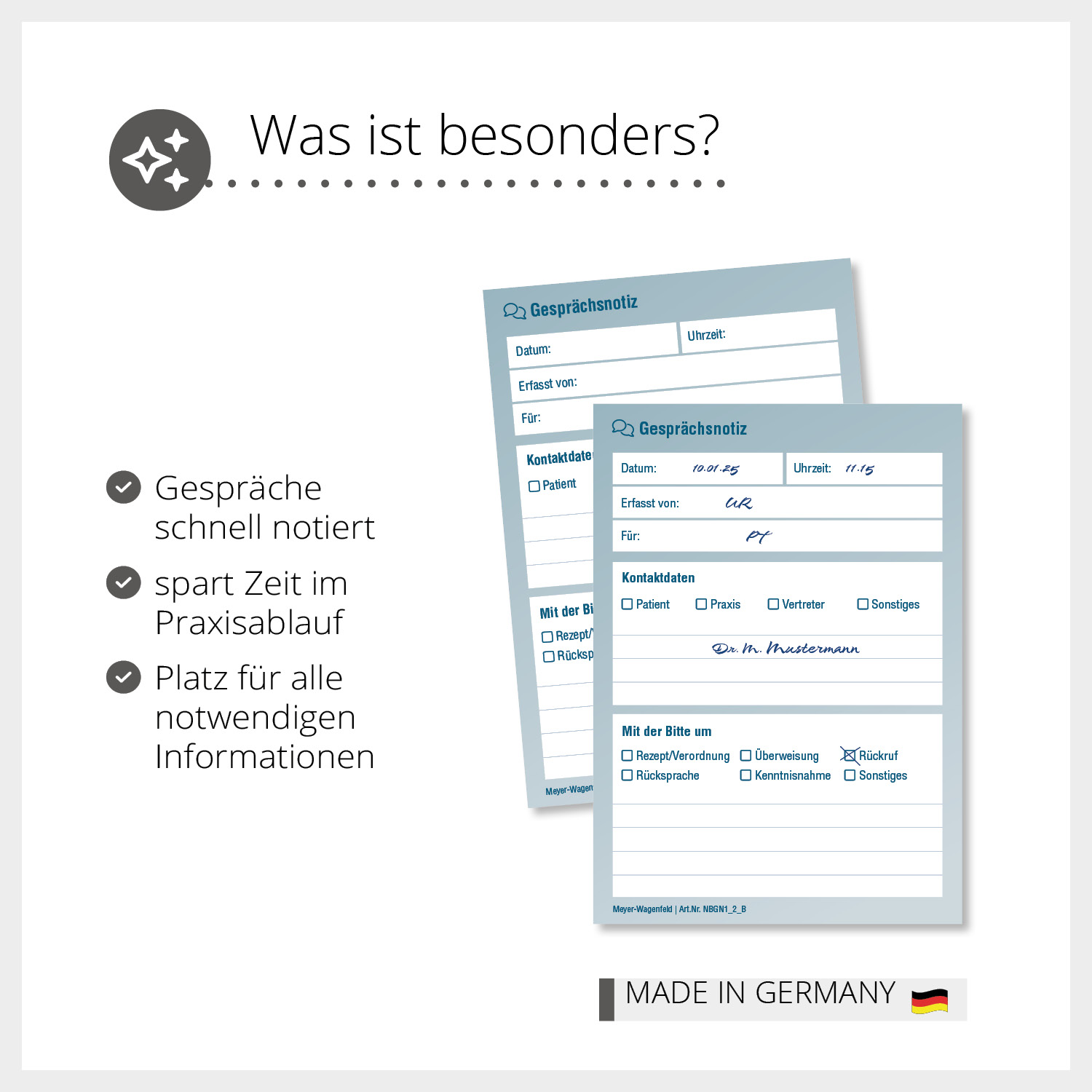 Die handlichen Zettel sind die perfekte Lösung für eine schnelle und unkomplizierte Dokumentation von Gesprächen mit Patienten, Vertretern, anderen Praxen oder Telefonaten. Sie wurde speziell für den Praxisalltag entwickelt und bieten eine praxisorientierte Gestaltung, die eine zügige Erfassung der Informationen ermöglicht.