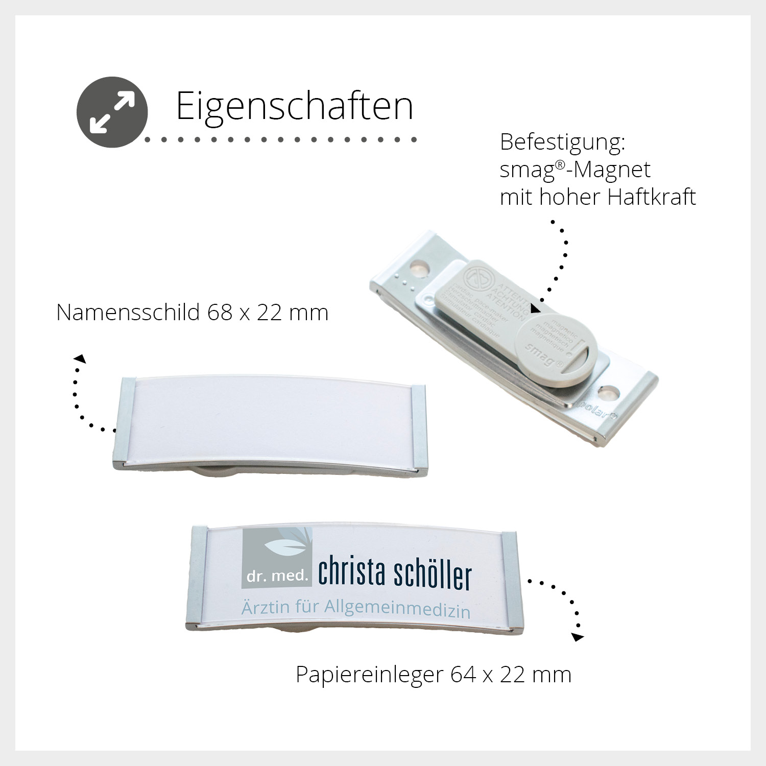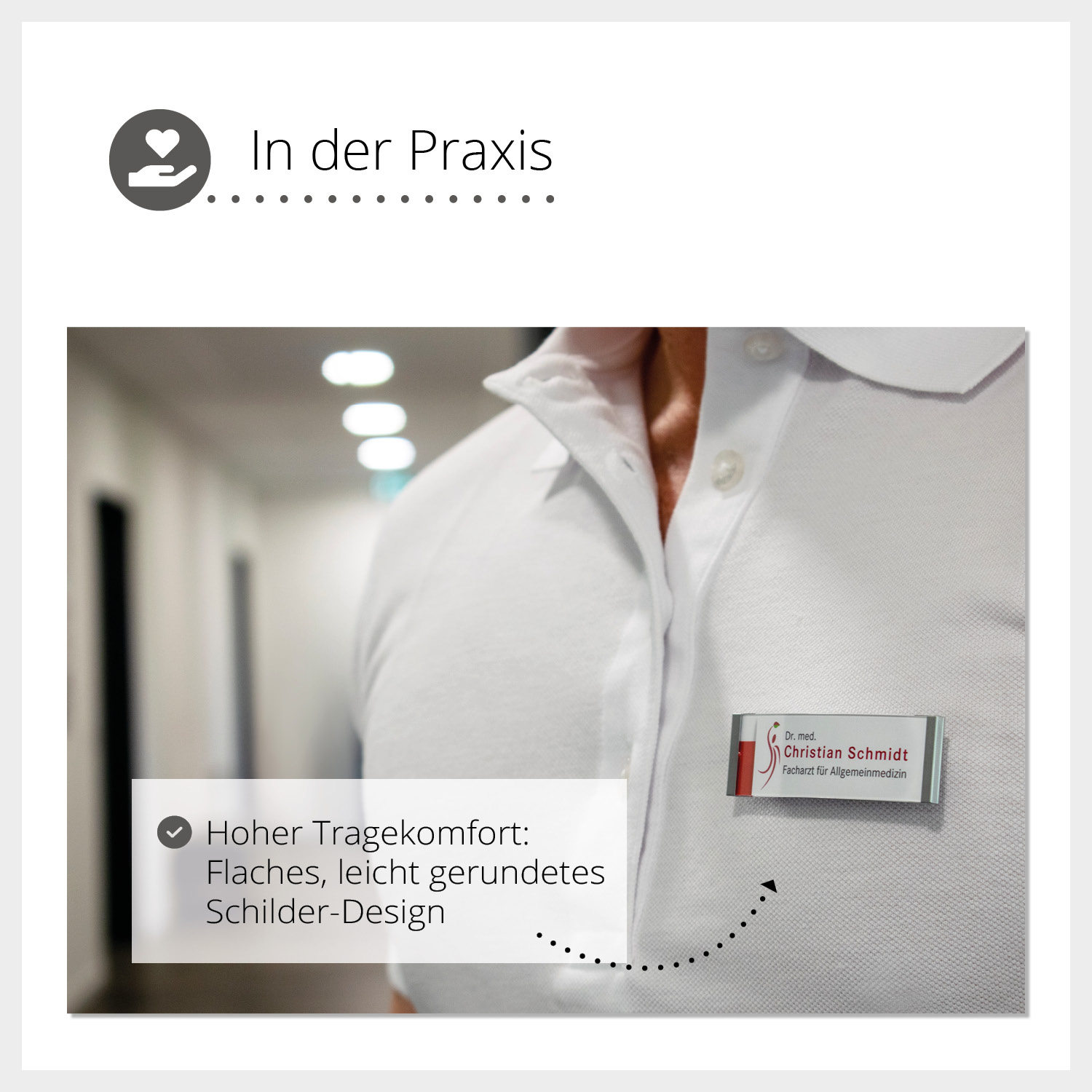 Mit personalisierten Namensschildern erzeugen Sie einen professionellen Eindruck in Ihrer Praxis und helfen Ihren Patienten, Vertrauen zu Ihrem Praxisteam aufzubauen. Das gesamte Namensschild besteht aus qualitativen Materialien: