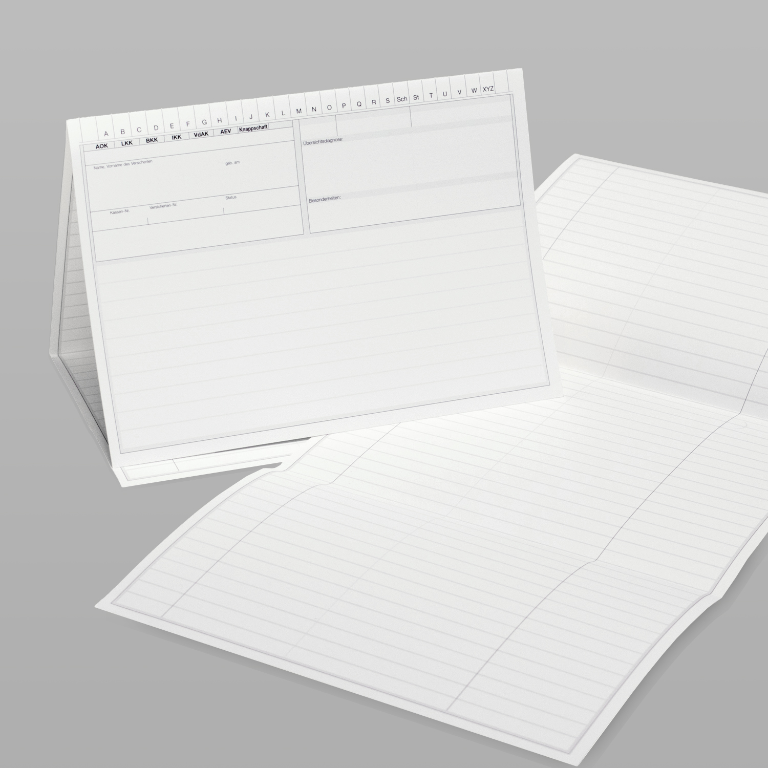 Das Format der Standard Patientenkarteikarte nennt sich DIN A5+. Die Karteikarte ist im geschlossenen Zustand etwas größer als das allgemein bekannte DIN A 5-Format, so dass sich z. B. auch mehrere gefaltete DIN A4-Zettel bequem einlegen lassen. Das Karteikartensystem ist 3-teilig nach unten hin ausklappbar und auf beiden Seiten zu beschriften. So haben Sie genügend Platz für alle Eintragungen - selbst über Jahre hinweg.