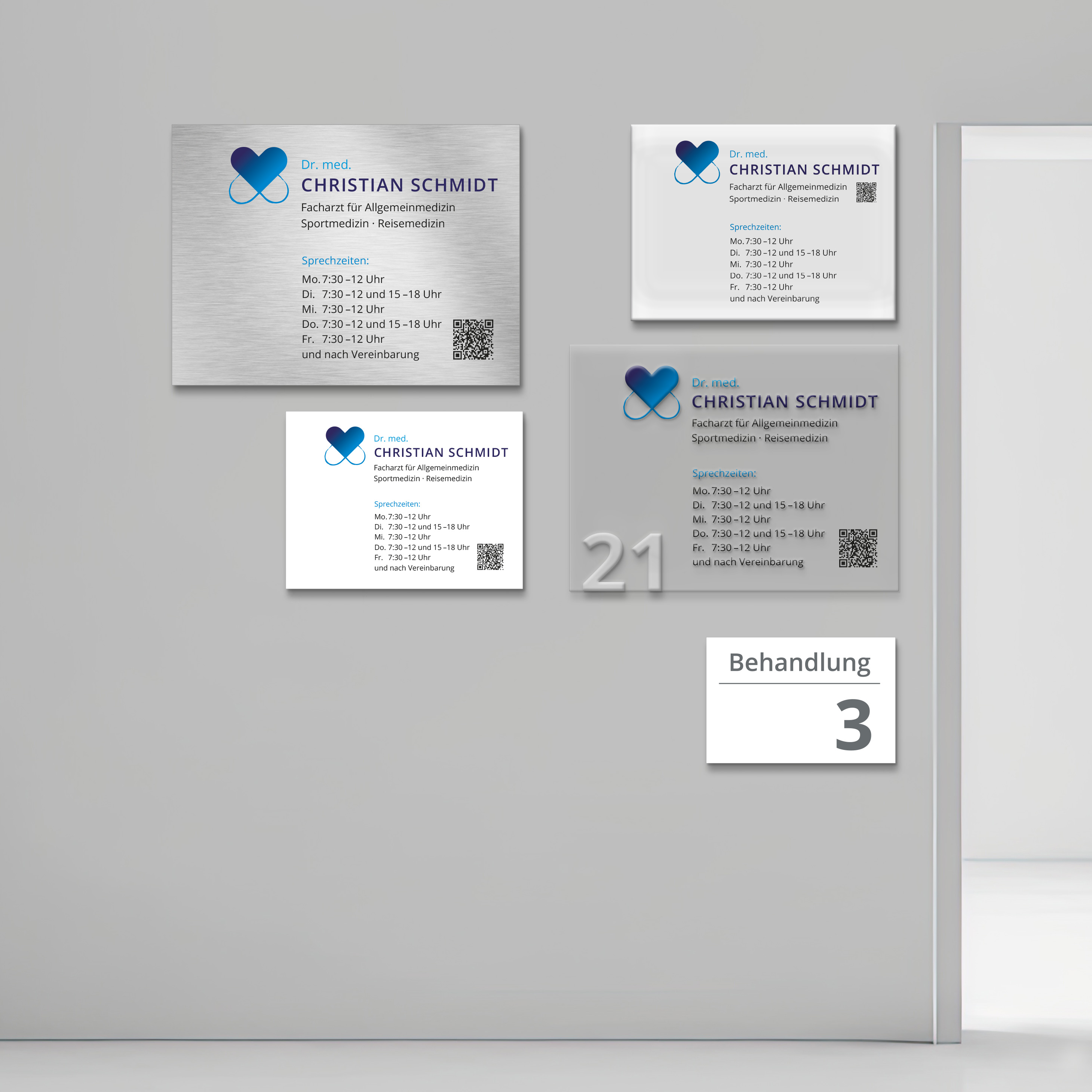 Professionelle Praxisschilder für Empfang, Wartezimmer und Außenbereich online bestellen. Individuell gestaltet in vielen Materialien und Größen.