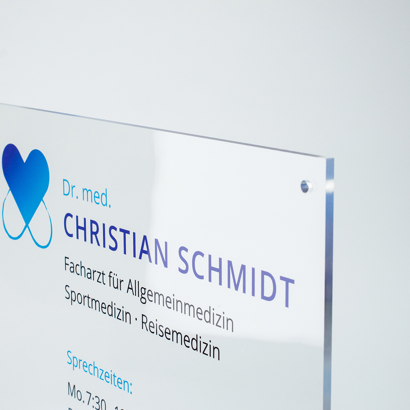 Acryl-Transparent-Schilder eignen sich für Ihre Praxis besonders gut, da sie mit ihrem Glanz und ihrer Tiefenwirkung einen besonders wertigen Eindruck hinterlassen. Sie können das Acryl-Schild wahlweise mit vollflächigem Weißdruck kaufen, sodass sich das Schild ggf. von der Wandfarbe im Hintergrund abhebt.