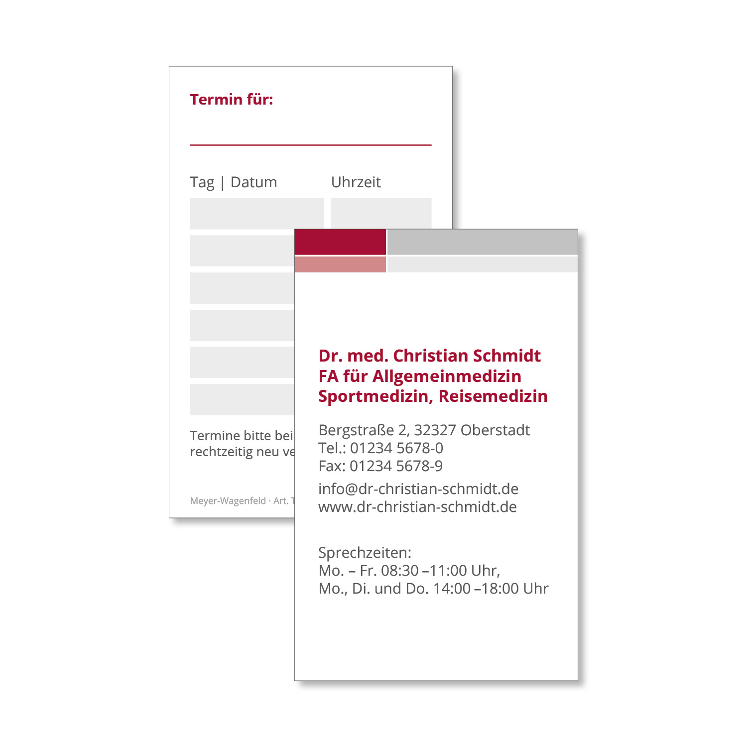 Die Terminkarten eignen sich sowohl für Arztpraxen aller Fachrichtungen als auch für Heilpraktiker, Tierärzte, Physiotherapeuten und Zahnärzte.
