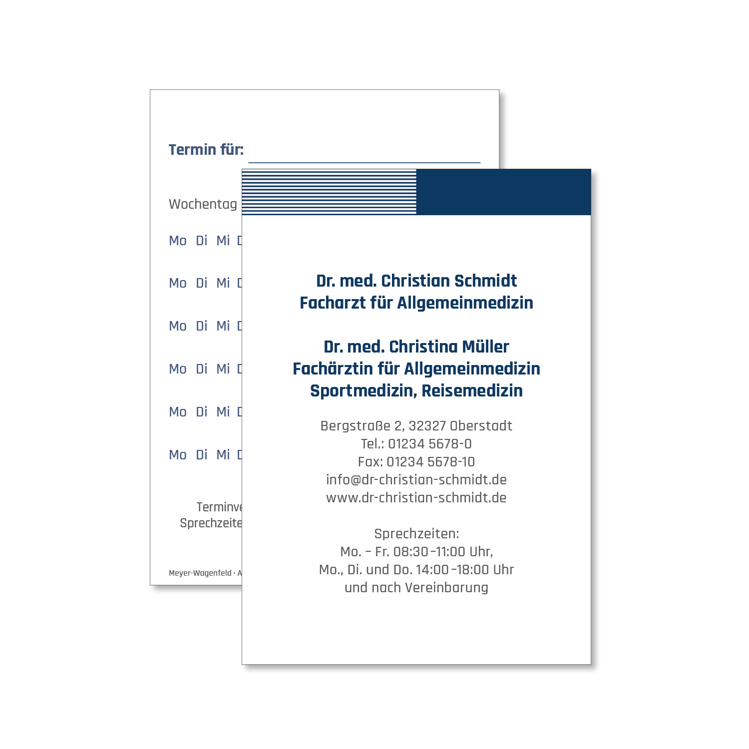 Die Terminkarte im DIN A7-Format lässt sich einfach beschriften und bietet ausreichend Platz für Ihre Kontaktdaten und Ihre Sprechzeiten. Auf der Rückseite können außerdem mehrere Termine eingetragen werden.