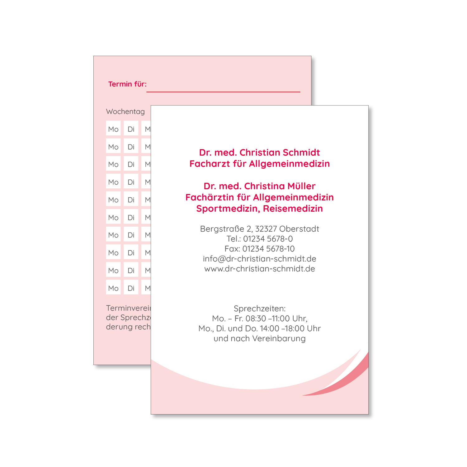 Die Terminkarte im DIN A7-Format lässt sich einfach beschriften und bietet ausreichend Platz für Ihre Kontaktdaten und Ihre Sprechzeiten. Auf der Rückseite können außerdem viele Termine eingetragen werden.