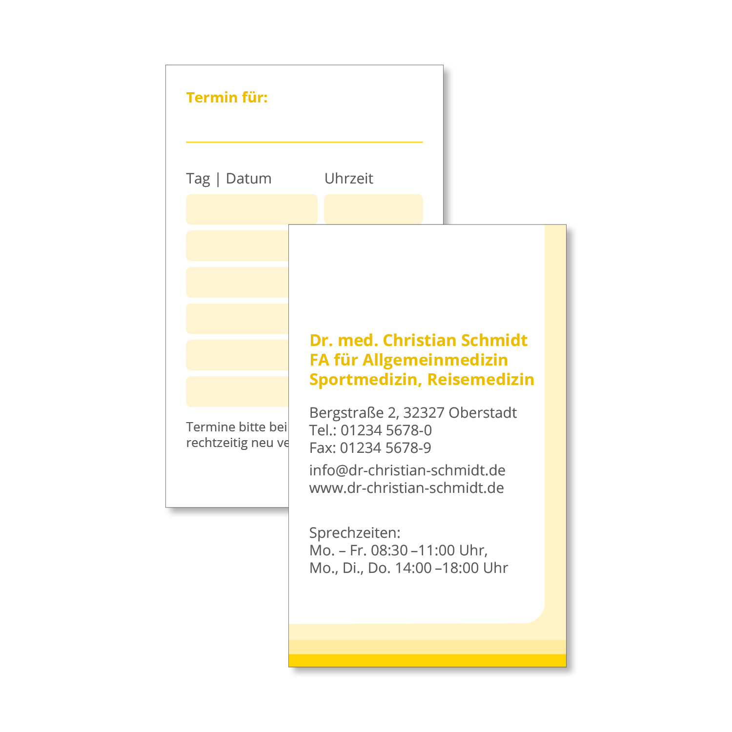 Die Terminkarten eignen sich sowohl für Arztpraxen aller Fachrichtungen als auch für Heilpraktiker, Tierärzte, Physiotherapeuten und Zahnärzte.