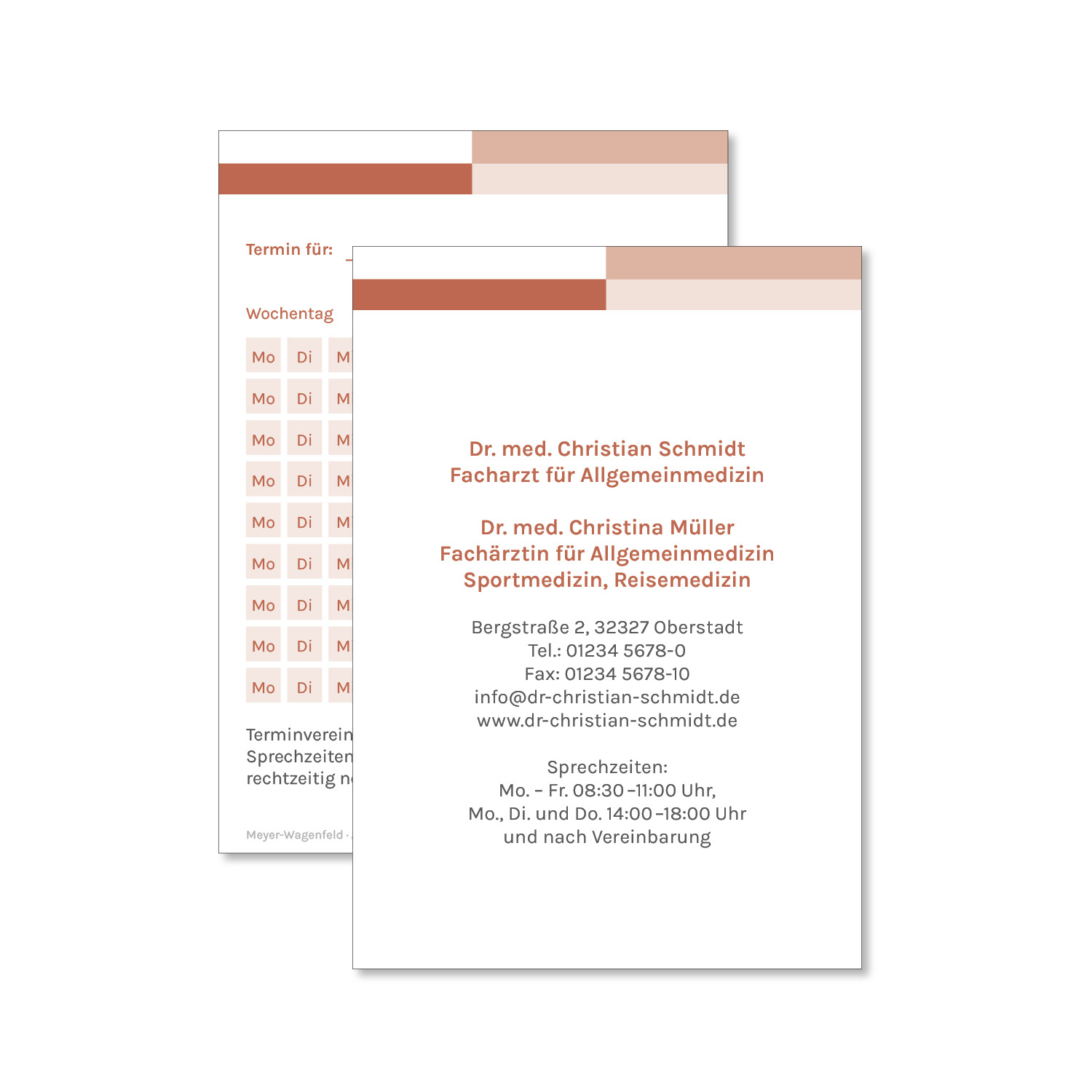 Die Terminkarte im DIN A7-Format lässt sich einfach beschriften und bietet ausreichend Platz für Ihre Kontaktdaten und Ihre Sprechzeiten. Auf der Rückseite können außerdem mehrere Termine eingetragen werden.