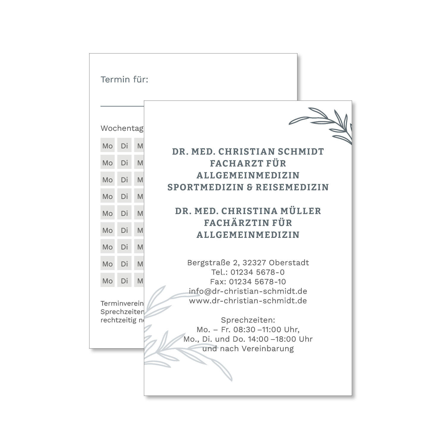 Die Terminkarte im DIN A7-Format lässt sich einfach beschriften und bietet ausreichend Platz für Ihre Kontaktdaten und Ihre Sprechzeiten. Auf der Rückseite können außerdem viele Termine eingetragen werden.