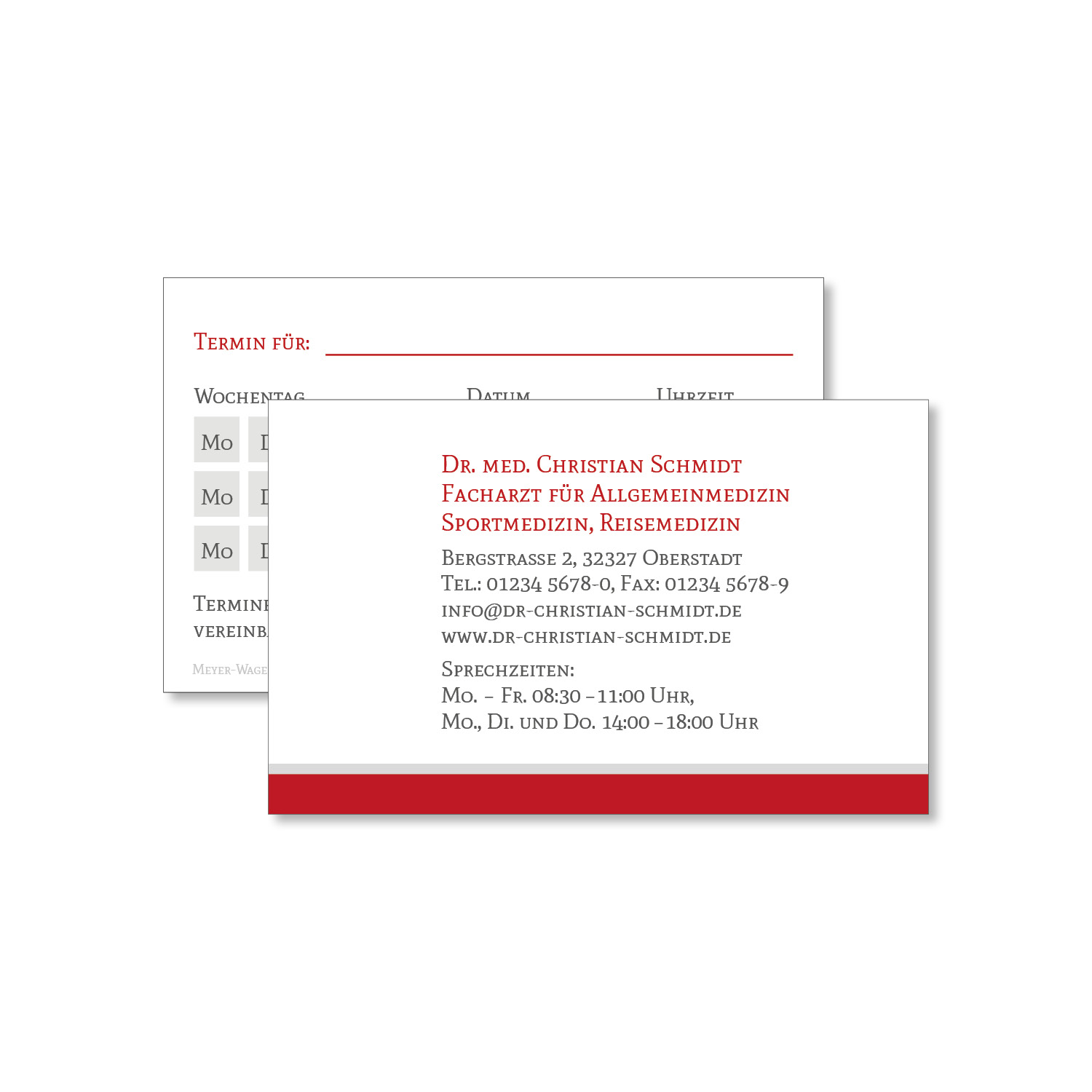 Die Terminkarten eignen sich sowohl für Arztpraxen aller Fachrichtungen als auch für Heilpraktiker, Tierärzte, Physiotherapeuten und Zahnärzte.