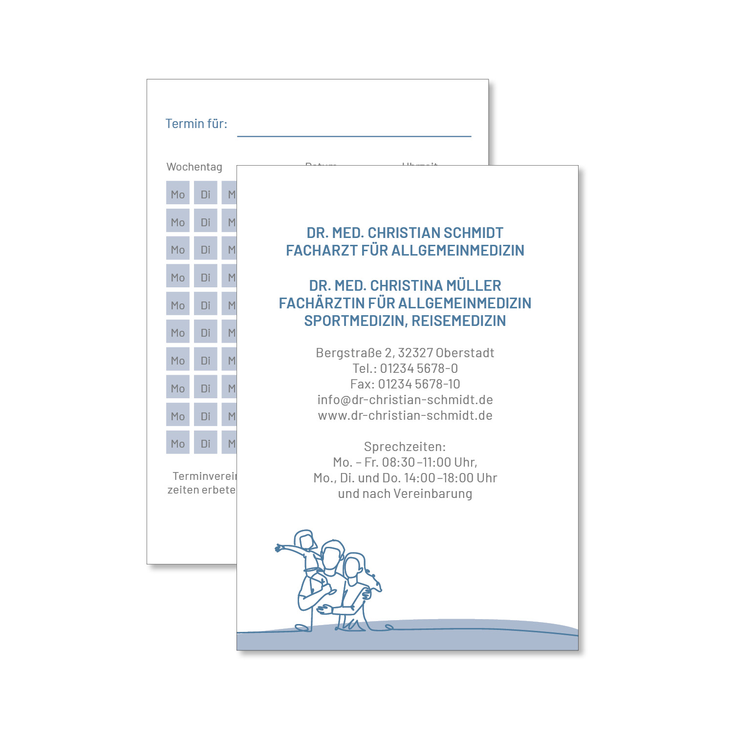 Die Terminkarte im DIN A7-Format lässt sich einfach beschriften und bietet ausreichend Platz für Ihre Kontaktdaten und Ihre Sprechzeiten. Auf der Rückseite können außerdem mehrere Termine eingetragen werden.