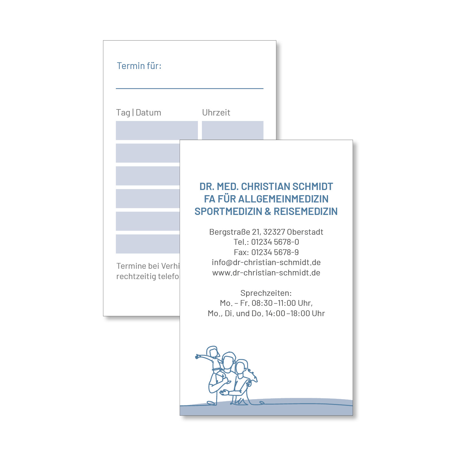 Die Terminkarten eignen sich sowohl für Arztpraxen aller Fachrichtungen als auch für Heilpraktiker, Tierärzte, Physiotherapeuten und Zahnärzte.