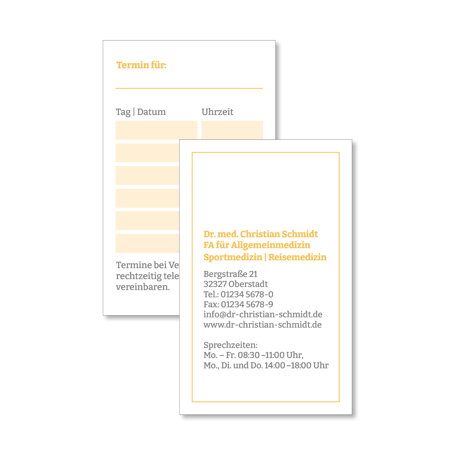 Die Terminkarten eignen sich sowohl für Arztpraxen aller Fachrichtungen als auch für Heilpraktiker, Tierärzte, Physiotherapeuten und Zahnärzte.