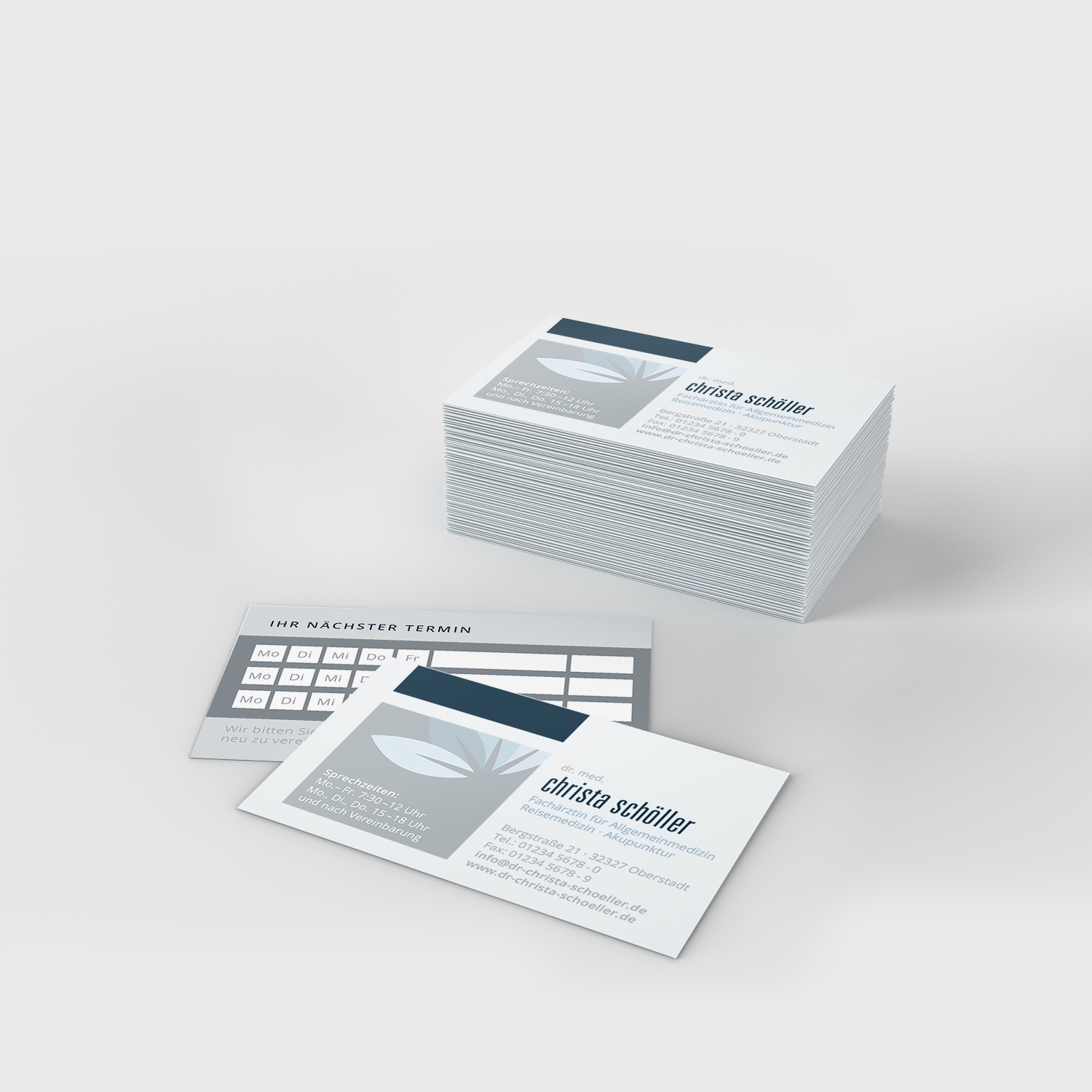 Terminkarten sind oft das Letzte, was Patientinnen und Patienten nach dem Praxisbesuch mitnehmen – und vielleicht das Erste, was sie bei der nächsten Vorsorge wieder in die Hand bekommen. Bei uns gestalten Sie Terminkarten oder Bestellkärtchen, die nicht nur praktisch sind, sondern den Charakter Ihrer Praxis widerspiegeln: professionell, sympathisch, individuell.