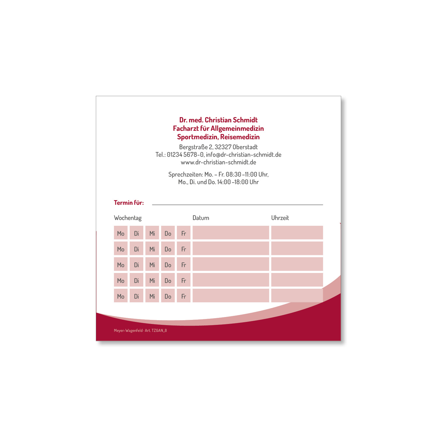 Der quadratische Terminzettel lässt sich einfach beschriften und bietet ausreichend Platz für Ihre Kontaktdaten und Ihre Sprechzeiten. Zudem können Sie mehrere Termine eintragen.
