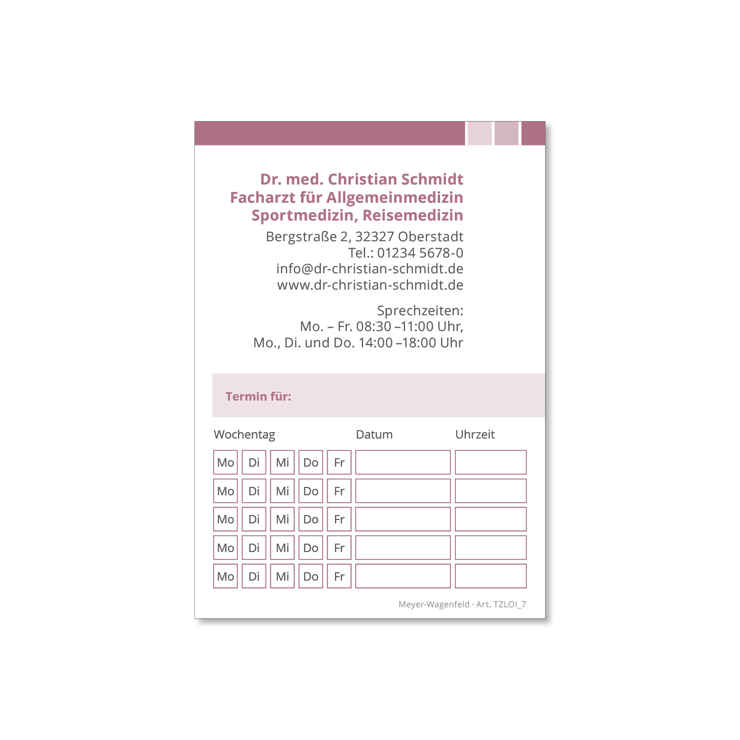 Die Terminzettel eignen sich sowohl für Arztpraxen aller Fachrichtungen als auch für Heilpraktiker, Tierärzte, Physiotherapeuten und Zahnärzte.