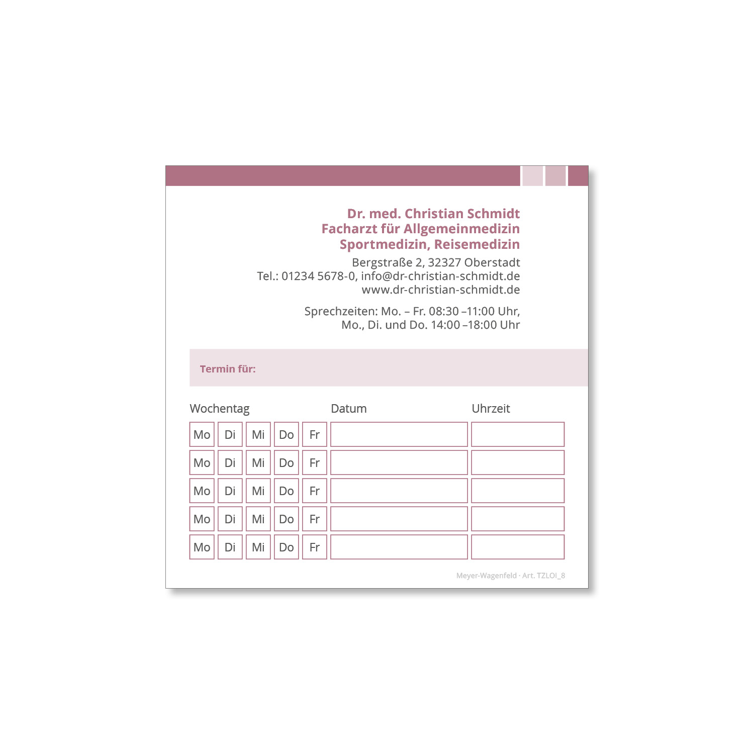 Die Terminzettel eignen sich sowohl für Arztpraxen aller Fachrichtungen als auch für Heilpraktiker, Tierärzte, Physiotherapeuten und Zahnärzte.