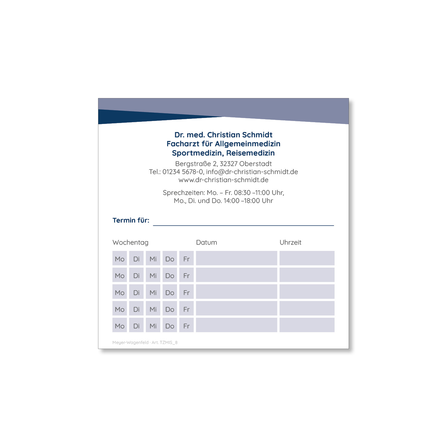Der quadratische Terminzettel lässt sich einfach beschriften und bietet ausreichend Platz für Ihre Kontaktdaten und Ihre Sprechzeiten. Zudem können Sie mehrere Termine eintragen.