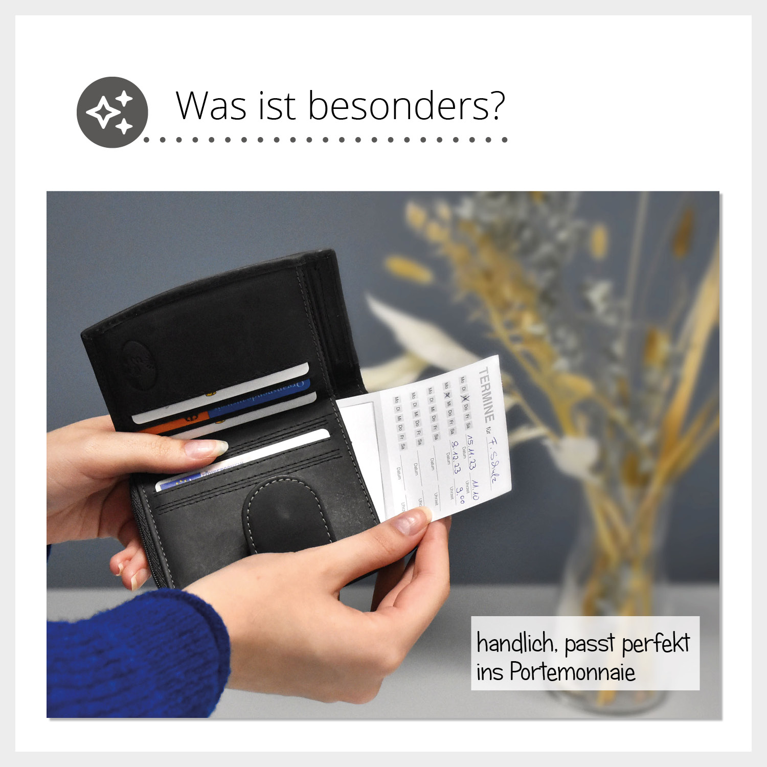 Dieser Terminzettel-Block überzeugt mit seinem neutralen, zeitlosen Design und bietet Platz für die Eintragung von bis zu fünf Terminen. Dank des handlichen DIN A7-Formats passt der Terminzettel perfekt ins Portemonnaie.