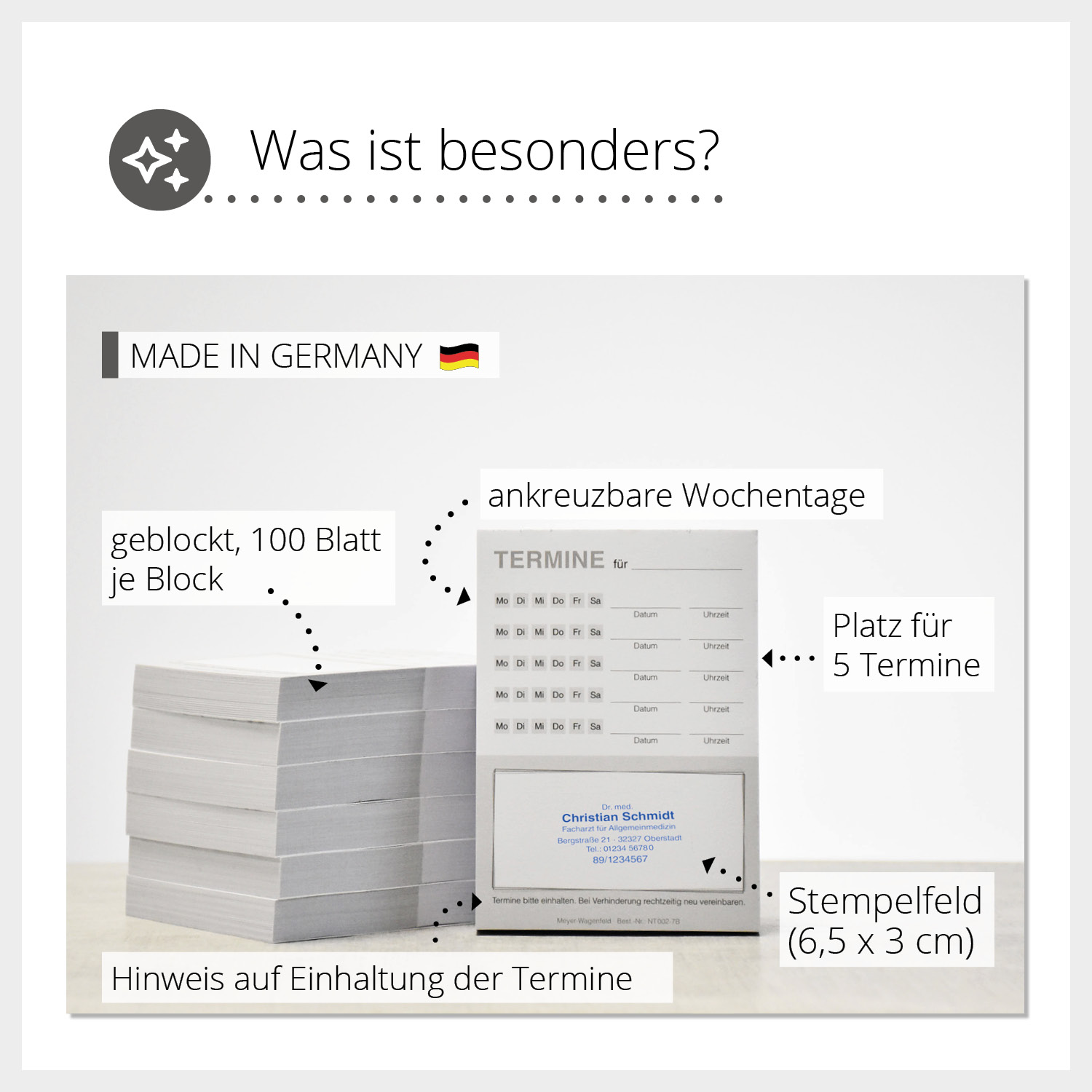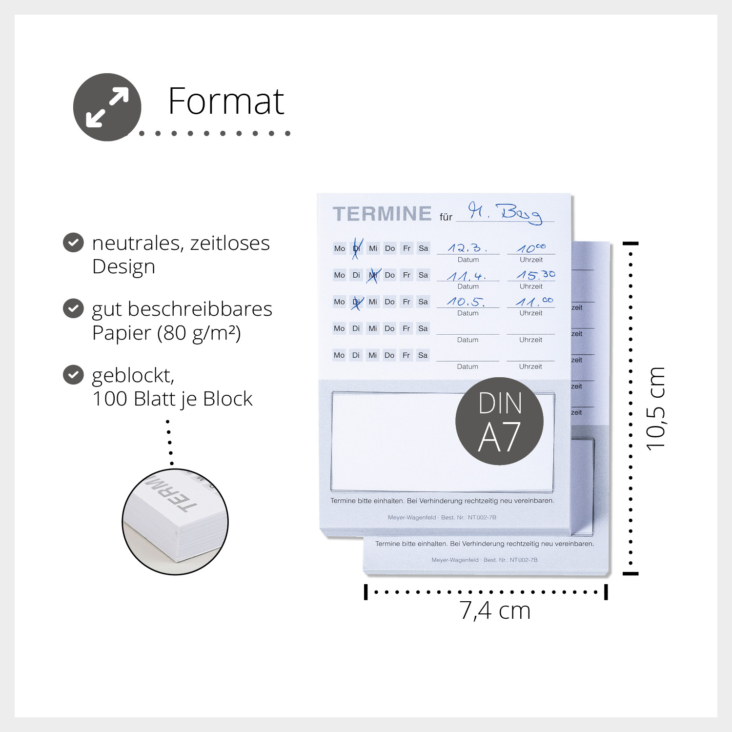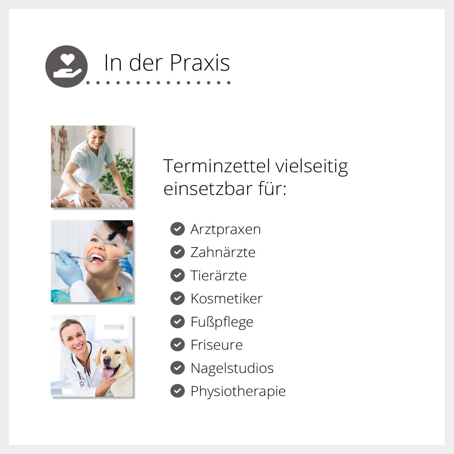 Die Terminzettel eignen sich sowohl für Arztpraxen aller Fachrichtungen als auch für Heilpraktiker, Tierärzte, Physiotherapeuten und Zahnärzte. Auch Kosmetikstudios und Friseursalons können diesen Terminblock perfekt für Kunden mit mehreren Folgeterminen nutzen.