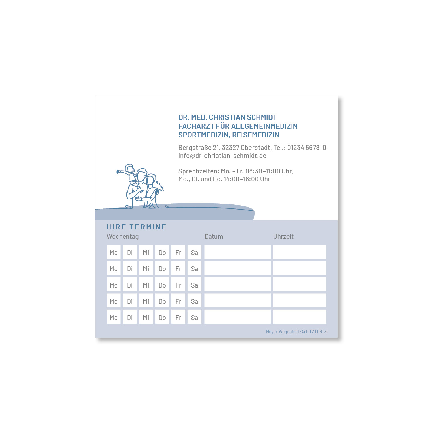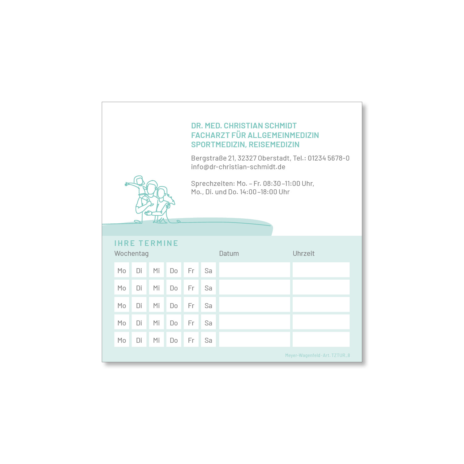 Der quadratische Terminzettel lässt sich einfach beschriften und bietet ausreichend Platz für Ihre Kontaktdaten und Ihre Sprechzeiten. Zudem können Sie mehrere Termine eintragen.