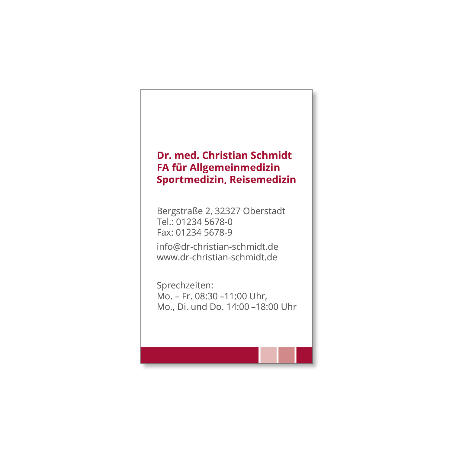 Eine individuelle Visitenkarte vermittelt einen professionellen Eindruck Ihrer Praxis. Sie dient zudem als Marketinginstrument und stärkt die Bindung zu Ihren Patienten. Mit einer Visitenkarte können Ihre Patienten Ihre Praxis einfacher weiterempfehlen oder Termine mit Ihnen vereinbaren.