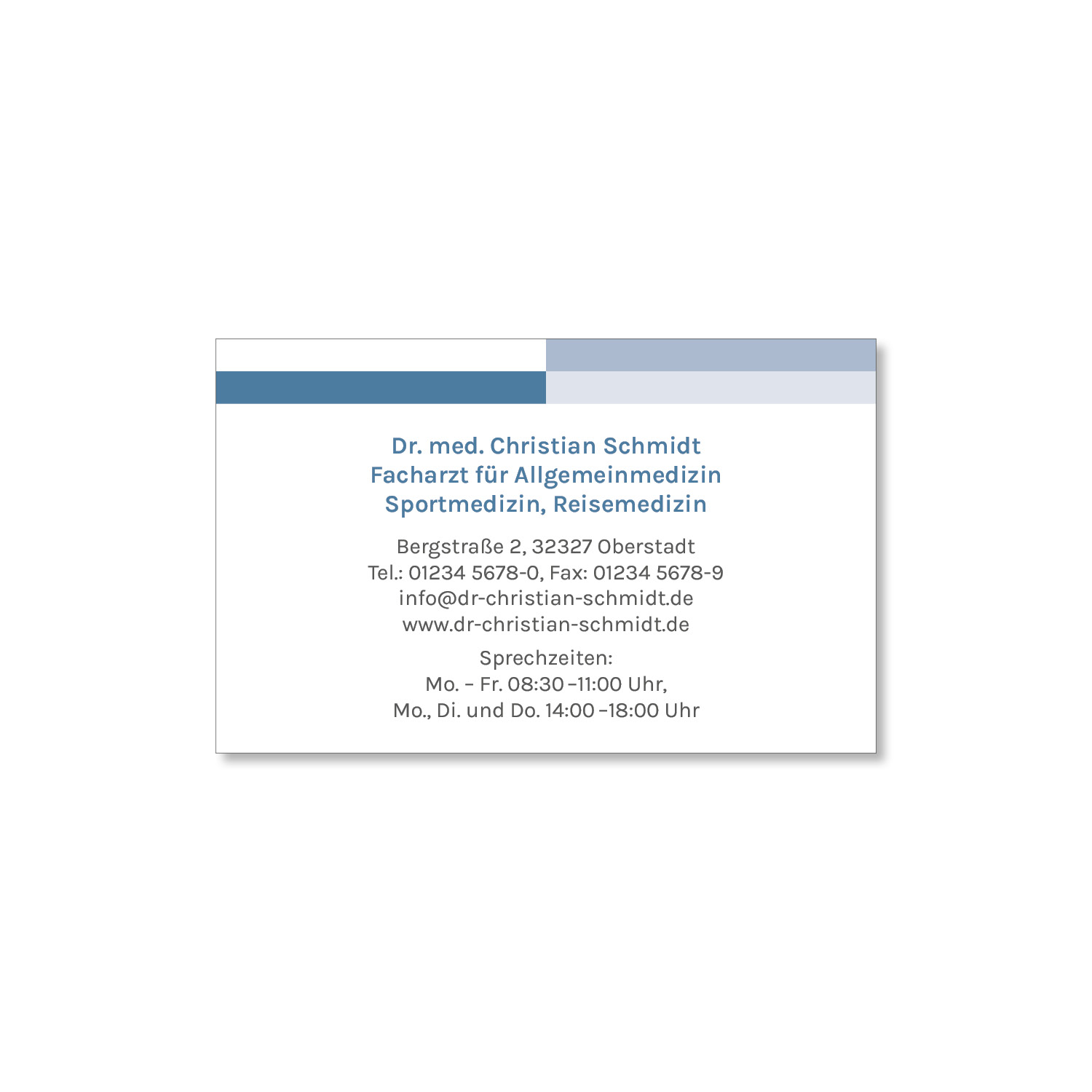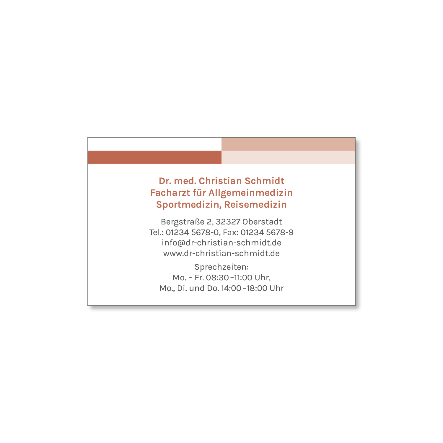 Eine individuelle Visitenkarte vermittelt einen professionellen Eindruck Ihrer Praxis. Sie dient zudem als Marketinginstrument und stärkt die Bindung zu Ihren Patienten. Mit einer Visitenkarte können Ihre Patienten Ihre Praxis einfacher weiterempfehlen oder Termine mit Ihnen vereinbaren.