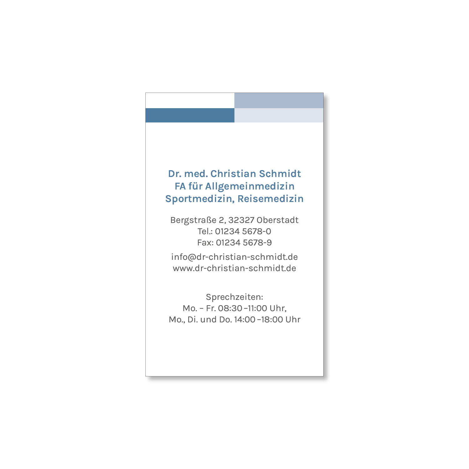 Eine individuelle Visitenkarte vermittelt einen professionellen Eindruck Ihrer Praxis. Sie dient zudem als Marketinginstrument und stärkt die Bindung zu Ihren Patienten. Mit einer Visitenkarte können Ihre Patienten Ihre Praxis einfacher weiterempfehlen oder Termine mit Ihnen vereinbaren.
