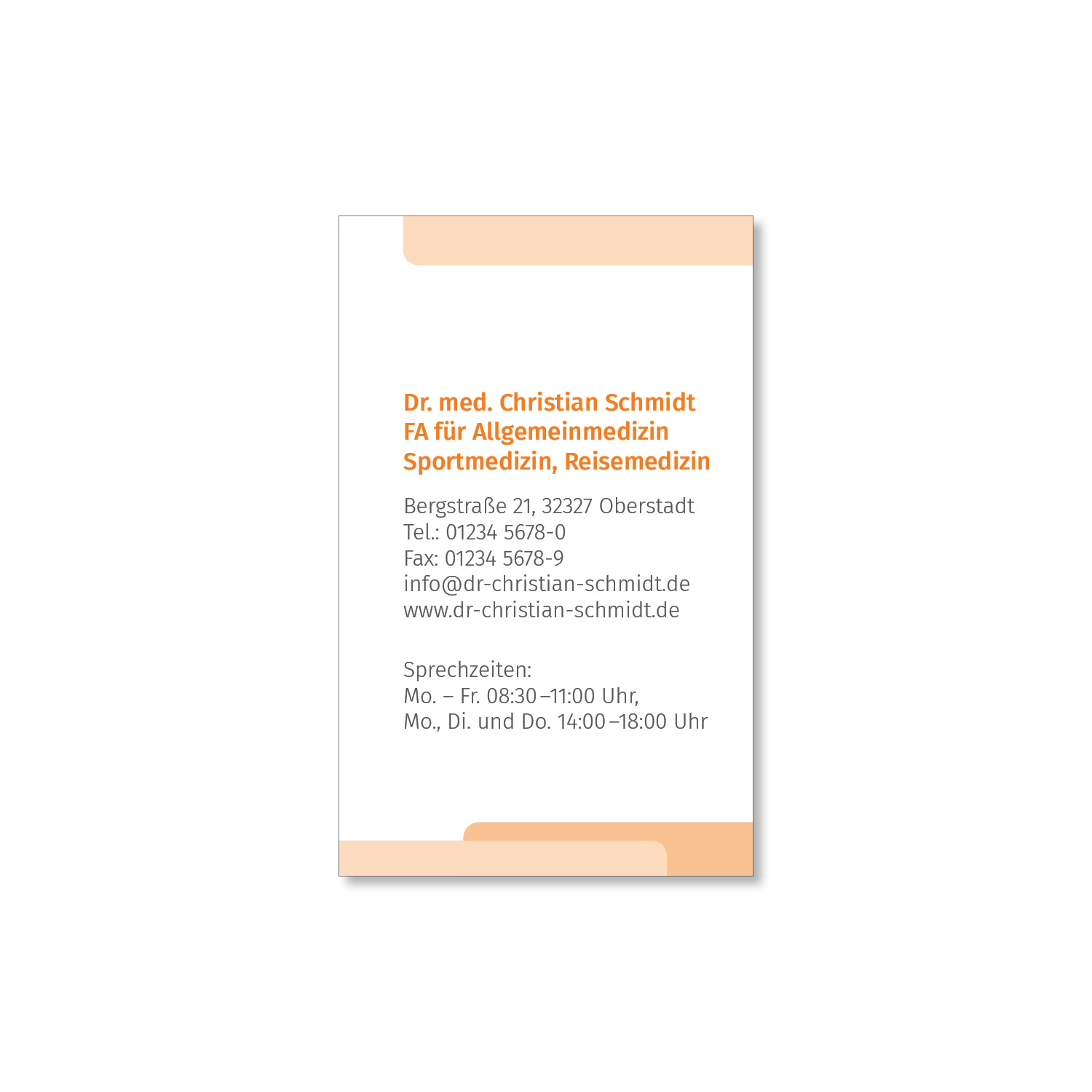 Eine individuelle Visitenkarte vermittelt einen professionellen Eindruck Ihrer Praxis. Sie dient zudem als Marketinginstrument und stärkt die Bindung zu Ihren Patienten. Mit einer Visitenkarte können Ihre Patienten Ihre Praxis einfacher weiterempfehlen oder Termine mit Ihnen vereinbaren.